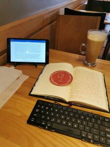Now sipping my honeycomb latte, I decided to move away from creativity to focus on typing up my work. I’m using a foldable Bluetooth keyboard that is paired to my new 8-inch tablet. I got the tablet purely for my writing, despite also putting my streaming apps on. I was looking at a typewriter or a word processor, but the prices are astronomical. That’s why I took a short contract out with O2 for twenty quid a month. After ten months, the tablet is mine and the study is over. That means I finally get to be creative for purely creative purposes. I researched and downloaded quite a few “simple writing” apps but in all fairness, Microsoft Word really does the trick just as well as any other that I’d tried.