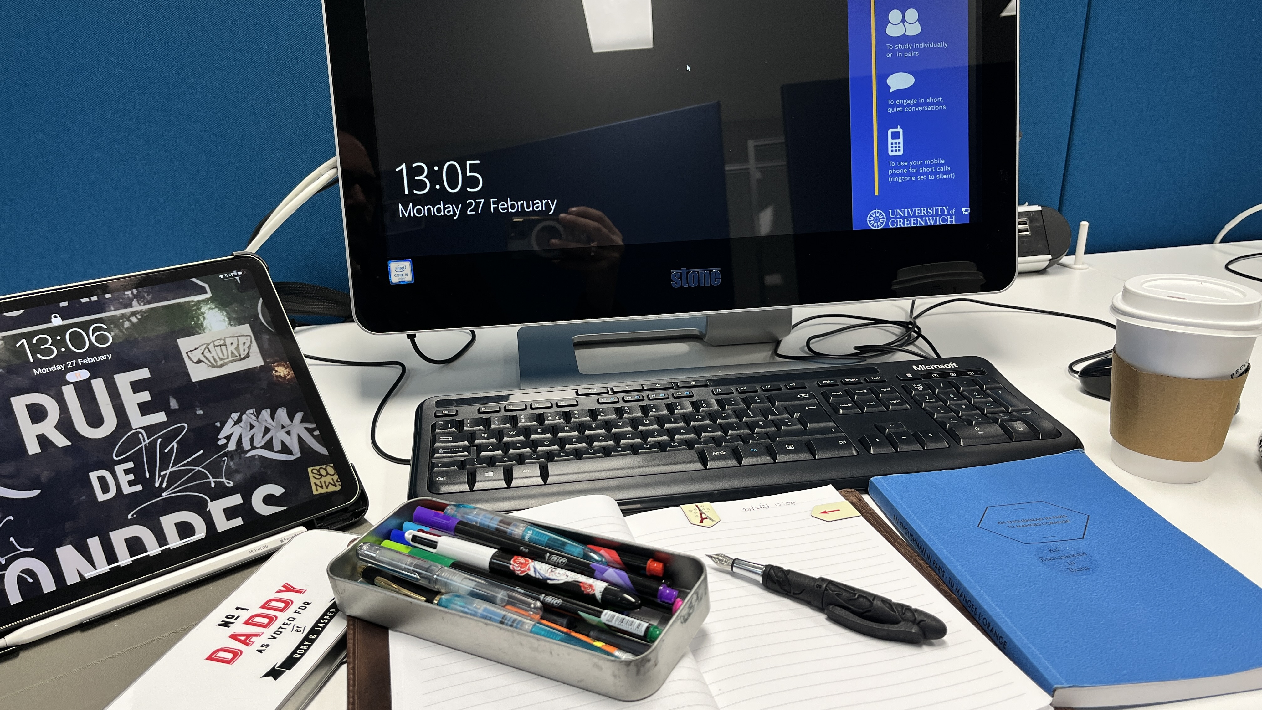 Who would’ve thought that I’d be back at a desk in a university, scribbling down notes before lunch? But it’s true. Not quite as it sounds but exactly as it sounds. I’m at the University of Greenwich in some sort of IT computer study room. It’s not totally the quiet room it claims to be. When I was at brick Uni, and even at college, there was always that one table that overstepped the mark, crossed the line and pushed boundaries. It does make a change for me not to be sat at that table.