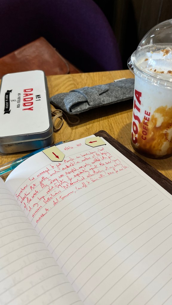 So, with my out of office now firmly on, the £500 MOT for the car waiting for my return, and the suitcase half-filled, I figured I’d go for a quick trip to Costa for a popcorn frappé and a little jot in the journal. Or notebook for the blog tags. I’ve reduced my writing bag down and swapped back to the pencil tin from the boys. This will be for the times that Nev is still sleeping.