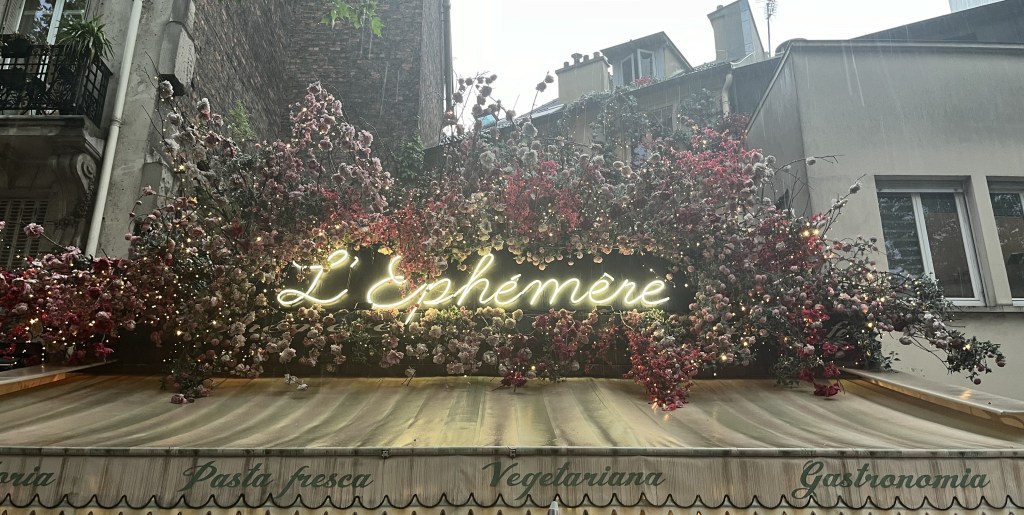 We walked from the hotel to the bottom of the road, turned left and carried on. At the (very) end of the street, we turned right – now around Porte d’Orleans – and made our way to the pharmacie that was still open. We were now looking at replenishing Nev’s carb reserves and remembered this place from our walk the day before as we returned from Notre Dame du Travail on foot. The restaurant was, as I said, quaint. The two waiting staff were as attentive as expected in French restaurants and constantly polite and friendly. The chef making the pizzas was behind a customer-facing counter and didn’t stop working. Aside from once to check his phone for 15 minutes. And this was around 15 minutes before the smell in the air changed. It went from a humid smell to that smell that lingers in the nostrils. The smell of a thunderstorm. The static electricity in the air. The smell that demands respect and a click on the G7 app for a taxi. Or maybe a bus, instead? Okay, a walk to the tram? Nope. After a 20-minute wait for the request of l’addition, we stood outside, waited for the non-arriving bus then walked back, taking the route we took to get here. And looking inside windows at the size of the appartments. My complaint about L’Ephemérè? They play the music on a loop. I think it was either 2 or 3 tracks.