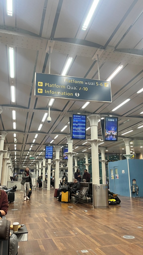 Eurostar Departure Lounge, St Pancras. Aside from Mile End station being closed owing to floods, the rain wasn’t too bad. Pretty much, my hair and thighs got drenched but the rest of me appears dry. So, my early start began with me waiting for the alarm to go off from 2am. The alarm was set up for four-thirty.
