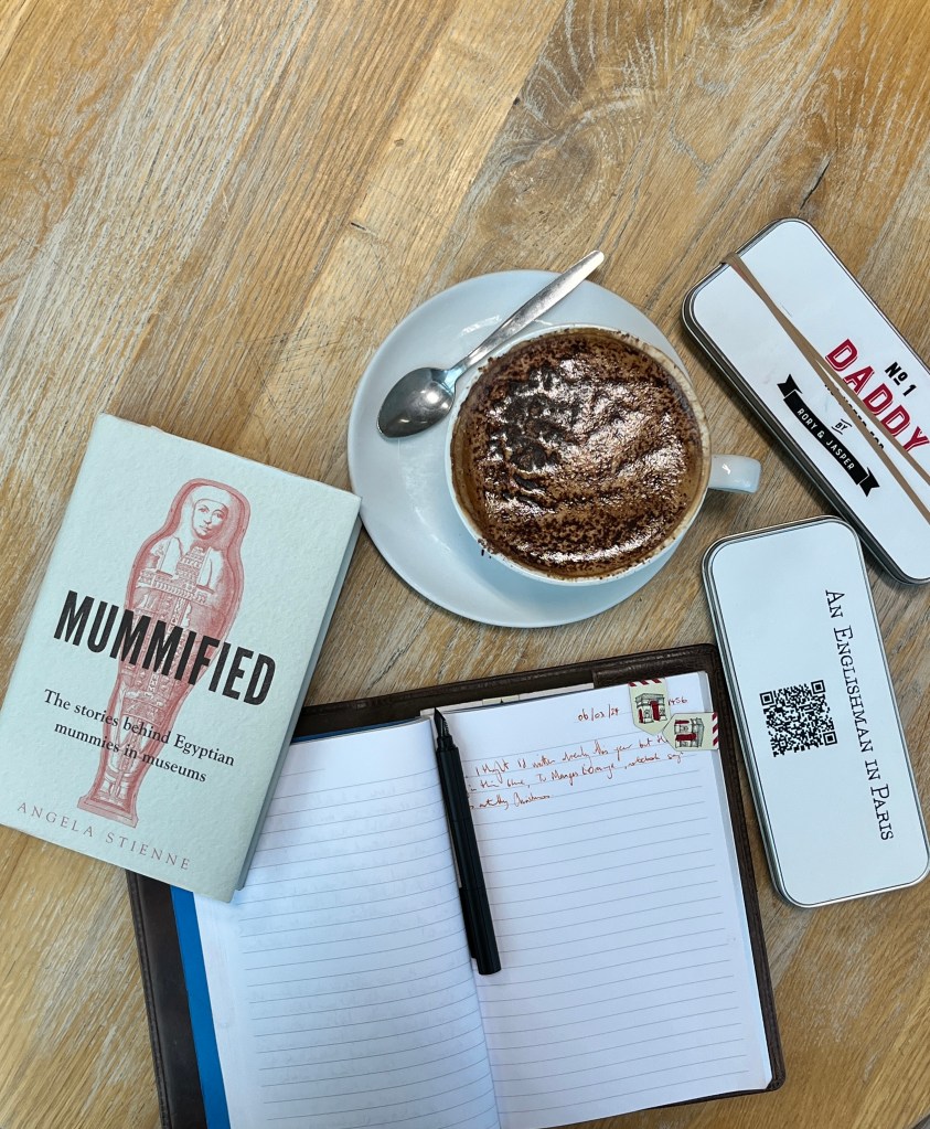 And now I’m back in Highams Park Tesco, sitting in the windowed corner of the Costa Coffee with a Mocha, my writing tools and a book called Mummified by Angela Stienne. It’s a good, thought-provoking book about mummies and their contribution to the world as well as deeper thoughts behind their exhibiting at museums. Afterwards, I’m getting the boys and we have a classroom rugby session for Jasper’s team before it’s back to mine for a little birthday cake for Rory.
