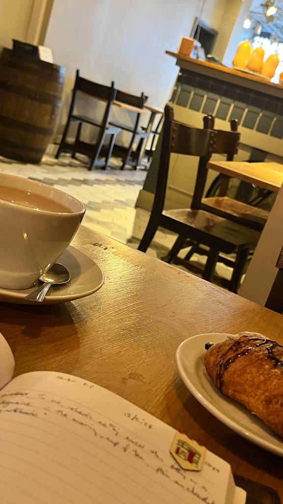 I’m sitting in a boulangerie, in the morning, with a cup of tea, a pain au chocolate and my notebook. I’m listening to 1.9 A Conversation with Jasper on my Coffee Pot Conversations hosted by An Englishman in Paris podcast which is due to be released tomorrow. It’s a rather sweet episode that took a while to put in place, as Jasper was more than a little nervous about it all. But he did exceptionally well unlike this Herbin fountain pen which is leaking her black ink all over the page. In fact, it’s only on the inside part of the page. I’ve gone through three-quarters of a cartridge writing three-quarters of a page in my blue “Tu Manges l’Orange” notebook. Once the ink has gone, I’ll swap pens and then once I’m back home, I’ll examine both pen and refill to work out what has caused this highly unexpected and very rare situation. All this and I’ve not even started my new job yet.